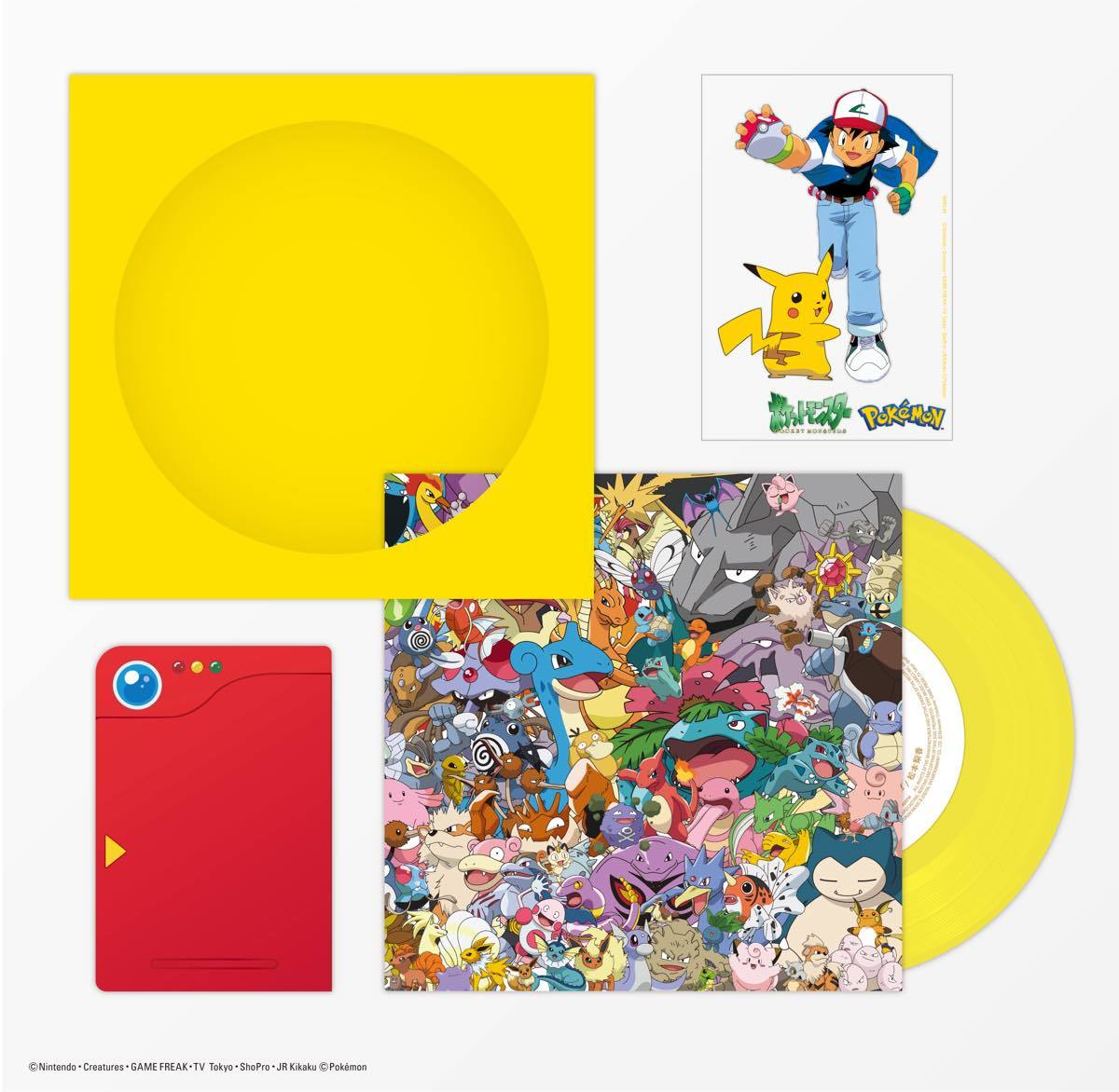 除了以初代畫風與151隻寶可夢為設計的A、B封面外,在這張7吋黑膠也包含了一張初代畫風的「小智&皮卡丘」貼紙,以及最初的寶可夢圖鑑機為造型的卡片,來供曾經喜愛初代《寶可夢》動畫的粉絲們收藏。