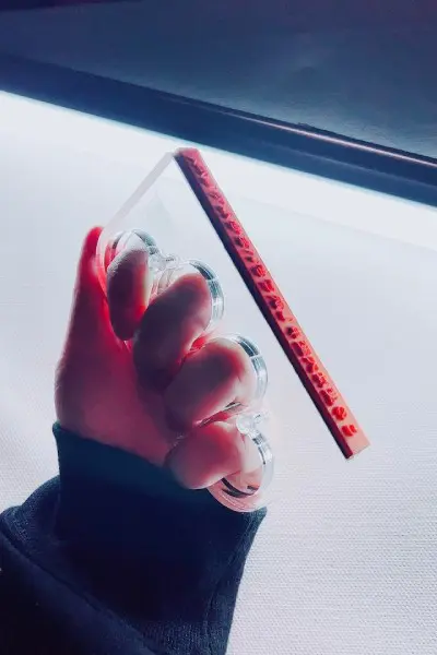將印章上刻上「この度は大変申し訳ございませんでした,這次我感到非常的抱歉」,只要套上後並用拳頭打在紙張上,就可以很簡單的表達自己的歉意。當然手指虎本體是使用壓克力製作而成,並不會有金屬手指虎的傷害顧慮。