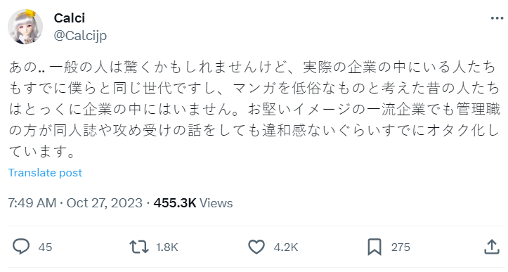 引起討論的是推主這篇發文,他表示其實實際企業中的同儕,現在都與自己是同世代的人,當然過去曾有「認為漫畫低俗無用」思維的人,其實已經不復在工作場域了。