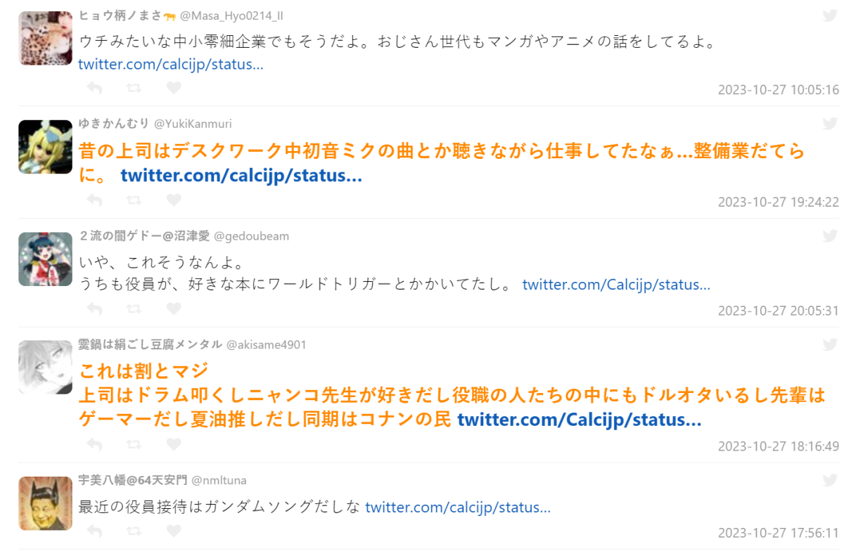 不少網友回應有同感,身旁周遭的人已經不會用以前那種心態看待喜歡動漫的人,甚至越來越多人大方展示自己的喜好。亦有網友表示自己的上司就辦公室聽初音未來的歌,現在也出現不少喜歡動漫的政治人物,社會上對於動漫喜好接納度比過去好上不少。