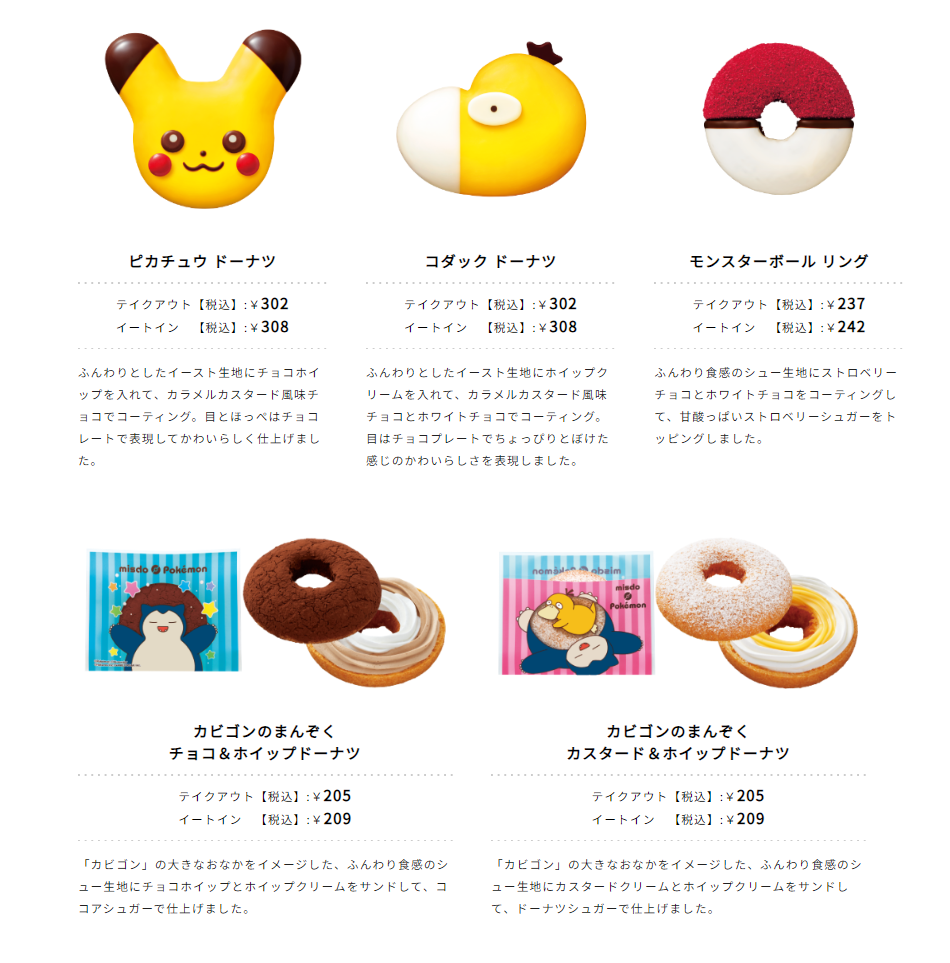 這次推出五款主題餐點,包含 : 皮卡丘多拿滋、可達鴨多拿滋、寶可球歐菲香、卡比獸甜甜圈兩種口味,皆以期間限定的方式販售,每次兩者合作都讓日本各地店鋪擠得水洩不通,可預見之後還有正月期間的福袋檔期,又會是每年定番的店鋪景色了 XD。