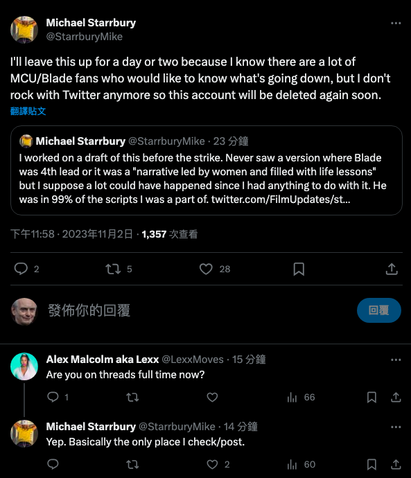 在關閉帳號之前,史塔柏瑞仍繼續回覆了一位網友,解釋他所寫的那版劇本絕對沒有刪減或降格刀鋒的戲份:「我還在參與編寫的時候,刀鋒是幾乎出現在每一場戲的,我不知道後來發生什麼事,我只能說,我不太相信他會在任何一版劇本被改成第四線的角色。」