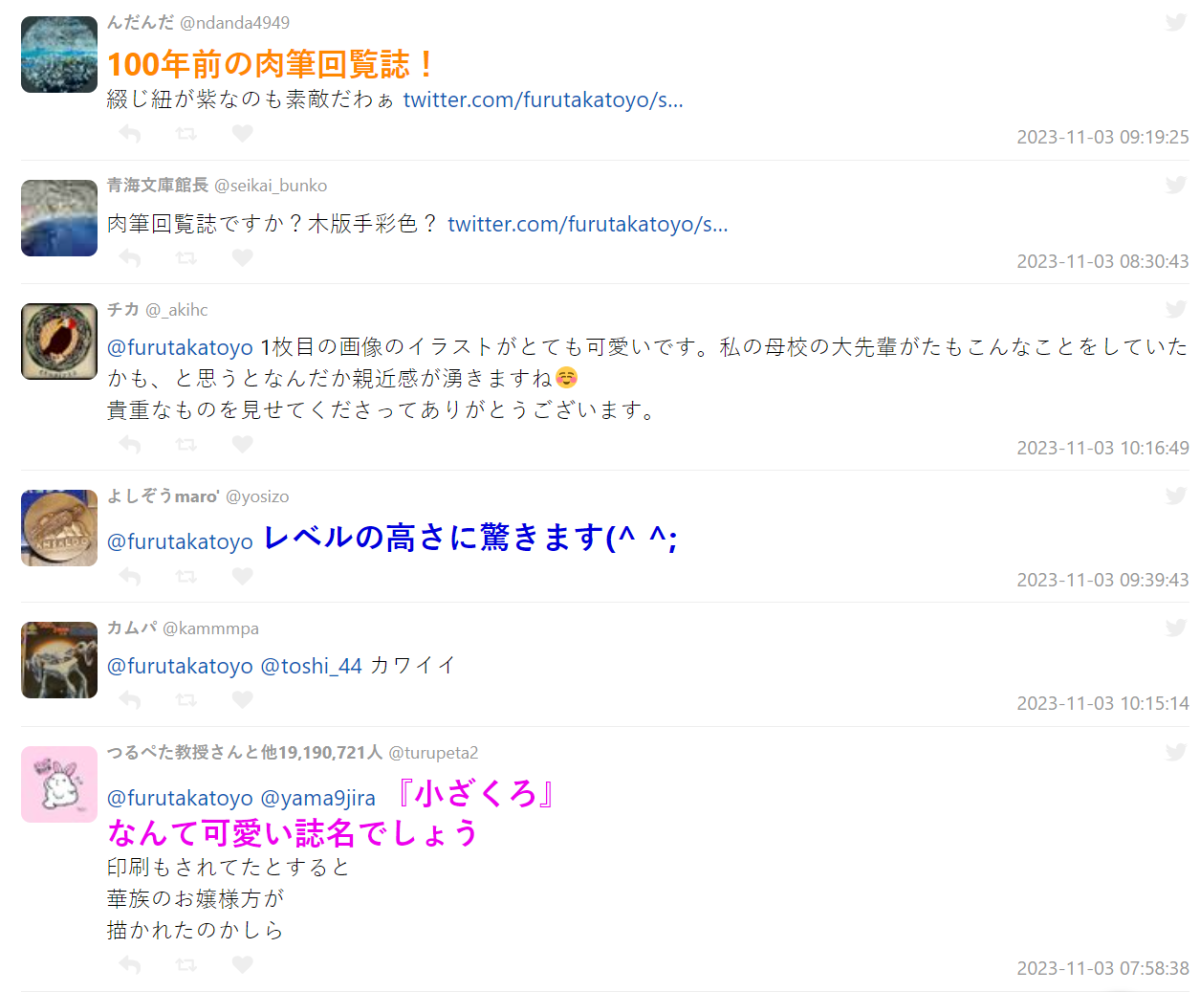 對於 100 年前的同人誌,不少網友給予高度評價,甚至比起料想中還要突出不少,由於是女學校出版品,刊名『小ざくろ』( 小石榴 ) 也被稱讚是很可愛的名稱。