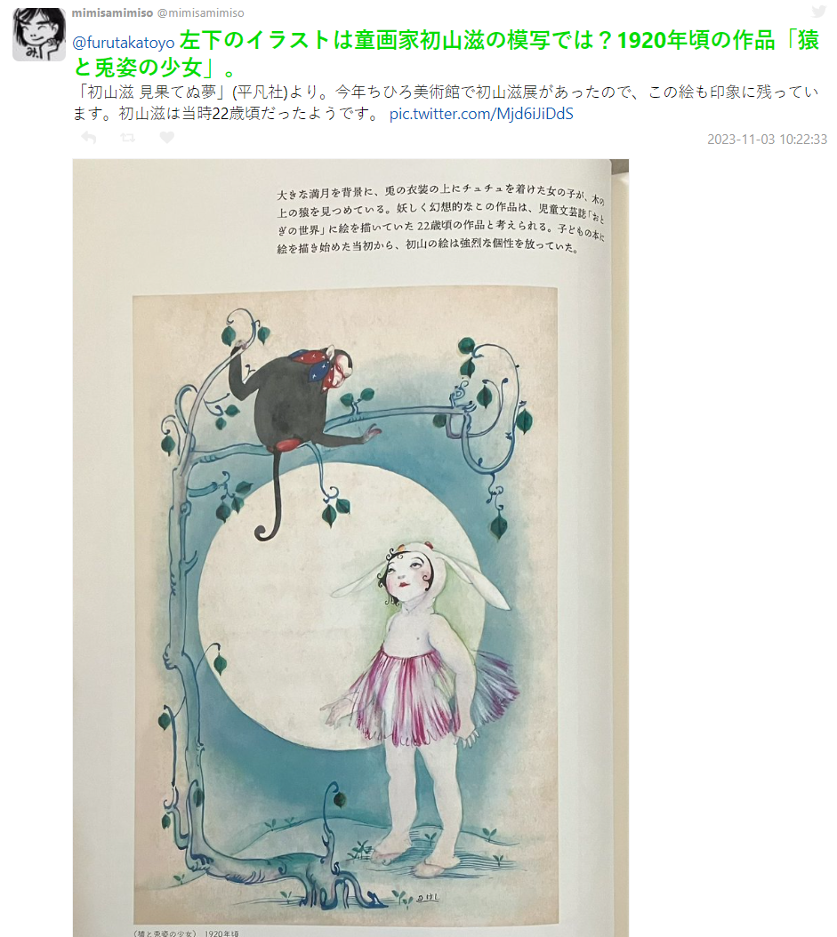 更有網友發現其中一幅插畫跟兒童書畫家初山滋的作品幾乎是一模一樣的,似乎是當時他的作品,根據初山滋 22 歲就在畫界打響名號,1920 年代的同人誌有他的作品似乎也不意外。