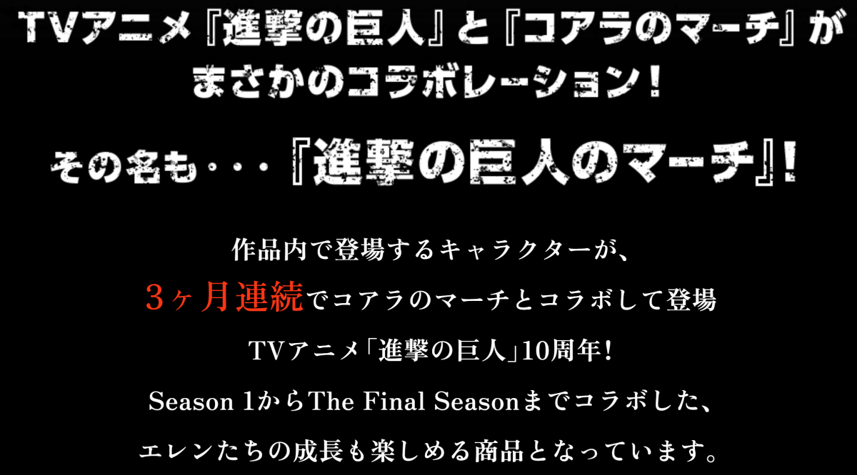 官方也預告,今年也是動畫《進擊的巨人》10 周年,將會連續三個月的聯名企劃持續展開,將會從第一季到最終季的主題陸續推出,讓粉絲與消費者可以盡情收集。
