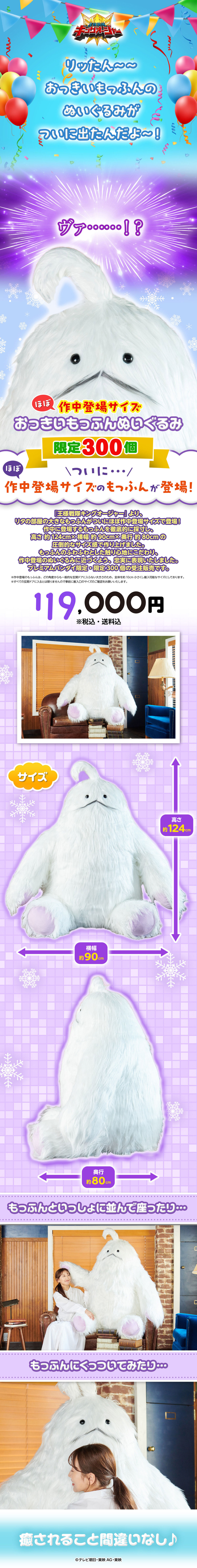 將在《王者戰隊君王者》劇中,冰雪之國「極寒」國王兼國際法庭最高裁判長的璃塔・卡尼斯卡房間那尊令人印象深刻的「巨大毛芙絨毛布偶」商品化尺寸全高達 124 公分(與劇中登場的尺寸幾乎相同),並仔細還原覆蓋全身的毛絨絨白色毛髮、頭上的呆毛與超萌的表情,手掌與腳底的粉紫色肉墊也療癒再現。將具有壓倒性可愛的巨大毛芙帶回家,就可以體驗躲和璃塔一般,獨自躲在房間和毛芙娃娃自問自答的治癒時刻~