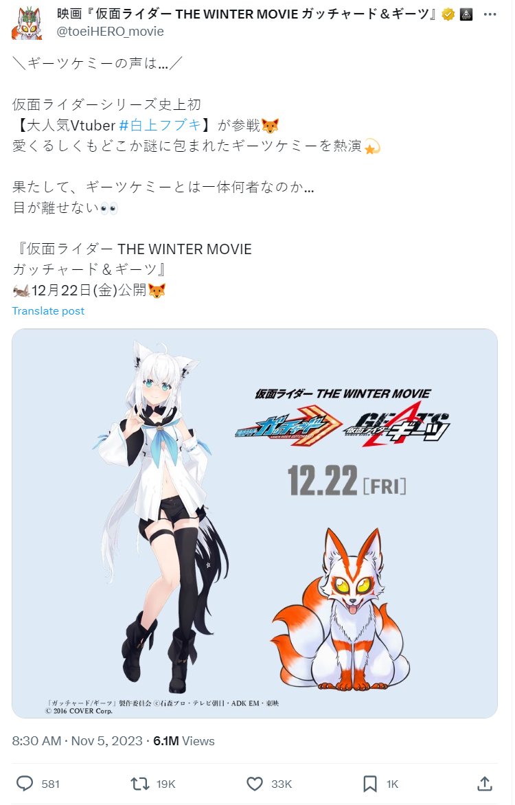 事實上先前官方釋出GEATS Chemy ( ギーツケミー ) 角色時,一直把配音聲優賣關子讓粉絲猜猜看是誰,從先前的特報影片就有粉絲在猜測是否為 VTuber 來擔綱,沒想到真的是跟 Chemy 同樣為狐狸的白上吹雪來配音,也讓不少粉絲感到驚喜。