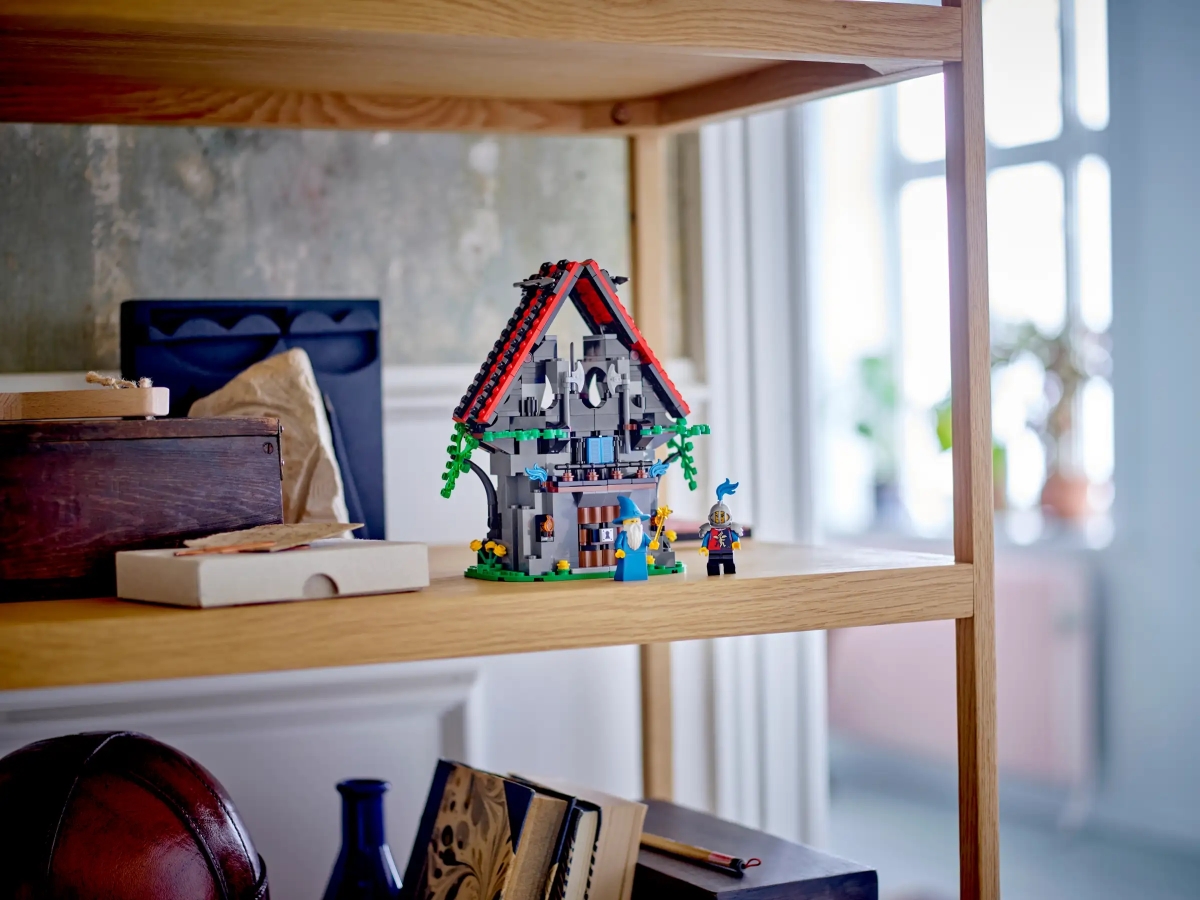 這一款樂高可視為是編號 6048 的同名盒組、1993 年的「馬吉斯托的魔法工作坊」之更新版本,零件數來到 365 片,建築部分保留了原始版本的輪廓,包含紅黑配色的斜屋頂、兩旁的樹木、佩掛在二樓位置的武器......等,但在一樓大門做了更新,新版本採用更加精緻的木門、上頭還加了一個大鎖的印刷零件,二樓也加了欄杆,不過會讓新入坑玩具人感到可惜的應該會是大門上方兩側的藍色龍形裝飾現在改以藍色羽毛代替。