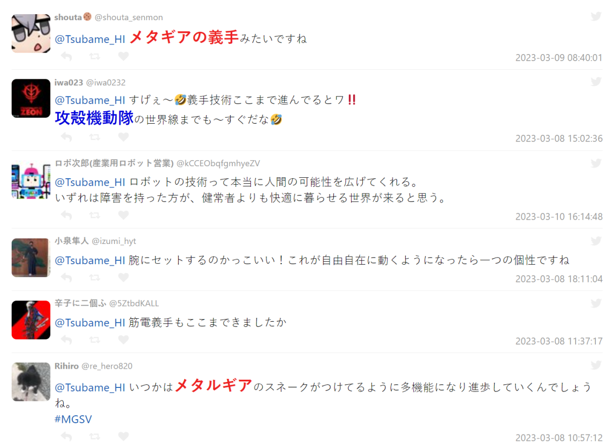 也被網友開玩笑表示,這很像是《機動戰士鋼彈 水星的魔女》裡面主角蘇萊塔·墨丘利的母親埃爾諾拉·薩瑪雅所使用的 GUND 技術義肢,剛好也是以醫療義體技術為出發點,只是後來被用到戰場軍事用途。