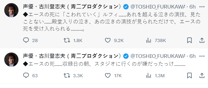 但你有想過配音的聲優怎麼看的嗎?最近日本 YouTube 上在播放《航海王 ONE PIECE》的過去動畫篇章,也讓經典的「艾斯之死」再次播出,成為 X 趨勢外。連艾斯聲優古川登志夫都發文談及當時動畫配音的心境,坦言當時心痛甚至不想進錄音室。