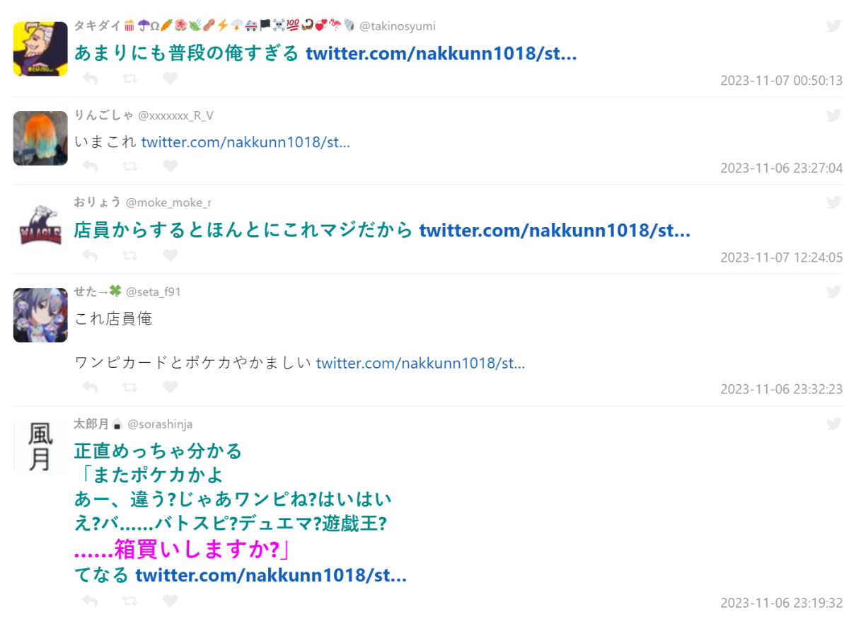 也有身為卡牌店員的網友表示,現在大多一來就是先問 : 「是想要寶可夢卡嗎 ? 如果不是,那要航海王、Duel Masters 或是遊戲王嗎 ? 要整箱的買嗎 ? 」,從這樣的反應也得知卡牌遊戲的人氣外,也可以理解現在卡牌店家怎麼看待買牌的消費者。