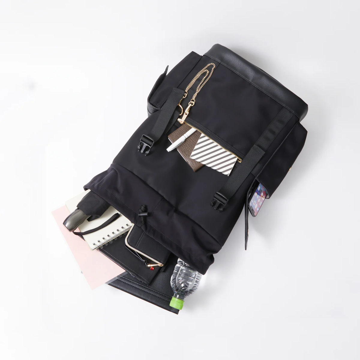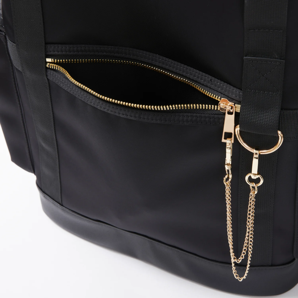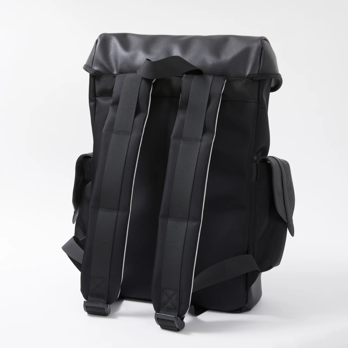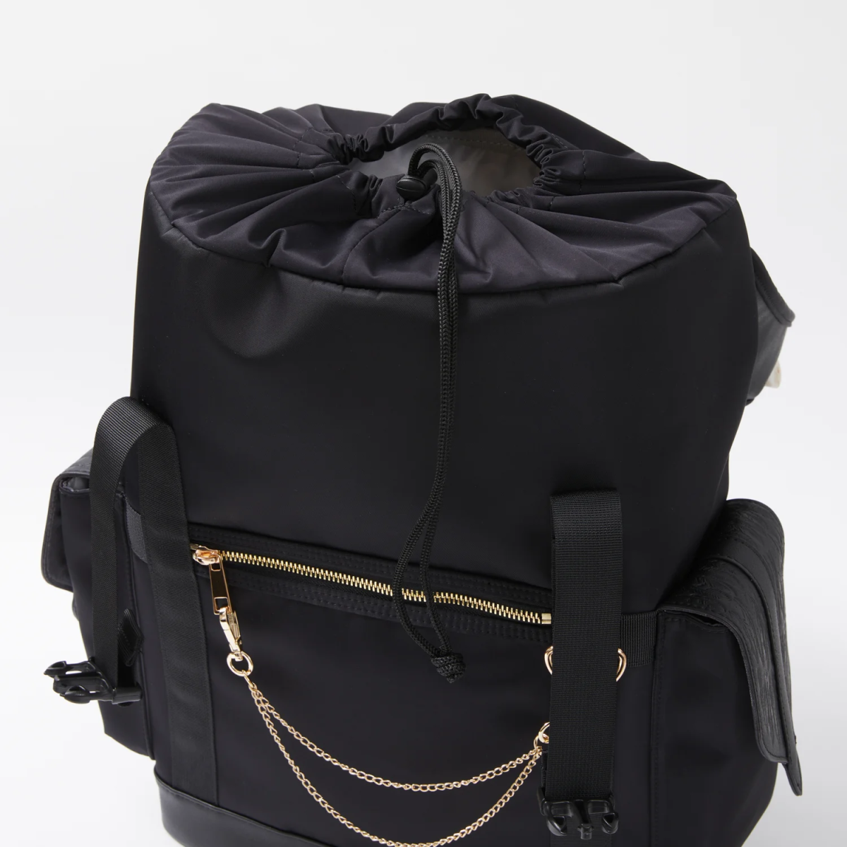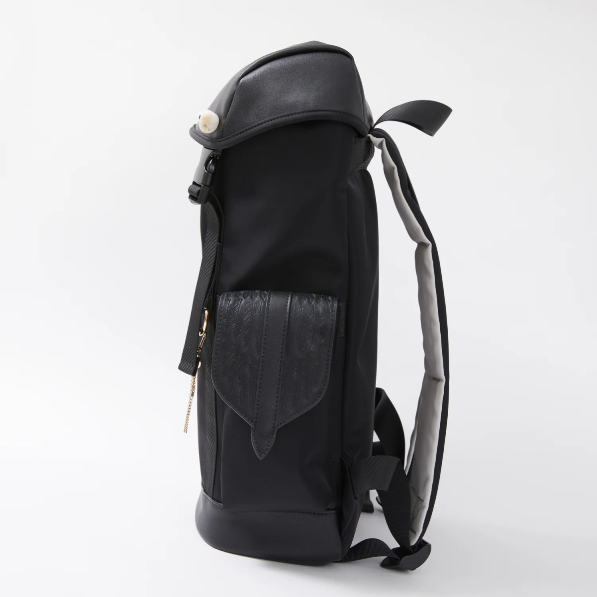 以黑色為基礎,材質上選用尼龍、帆布與合成皮革混合搭配,包包上細節有著頂端的白色角裝飾、前方金色吊飾與兩側收納袋上的羽毛壓紋。主收納空間採用束口袋方式,可以裝載大容量。