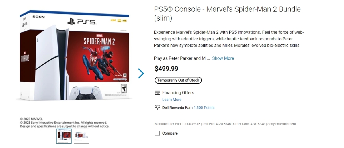 根據報導,《漫威蜘蛛人2》PS5 Slim同捆主機已經率先出現於《戴爾》( Dell)、《Walmart》等電商平台進行販售,以兩家平台所顯示的價格,則是定在499.99美金,內容物除了PS5 Slim主機本體外,也內含《漫威蜘蛛人2》遊戲片,不過目前則是顯示「缺貨」,意味尚未開放購買。