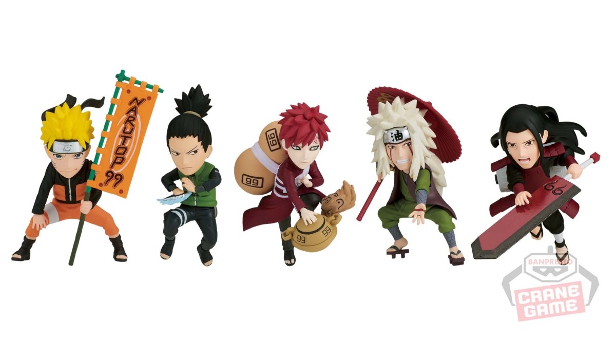 『WCF NARUTOP99 Vol.1』以岸本齊史老師為感謝粉絲特別繪製的「NARUTOP99 紀念插畫」為基礎,在僅有掌心大小的 7 公分尺寸中,Q 版還原角色精美的造型細節。首彈收錄有:鳴人、鹿丸、我愛羅、自來也、千手柱間五款角色,將插畫中生動的姿勢與服裝造型融入在三頭身比例設計中,喜歡火影忍者的玩具人不要錯過系列收藏!