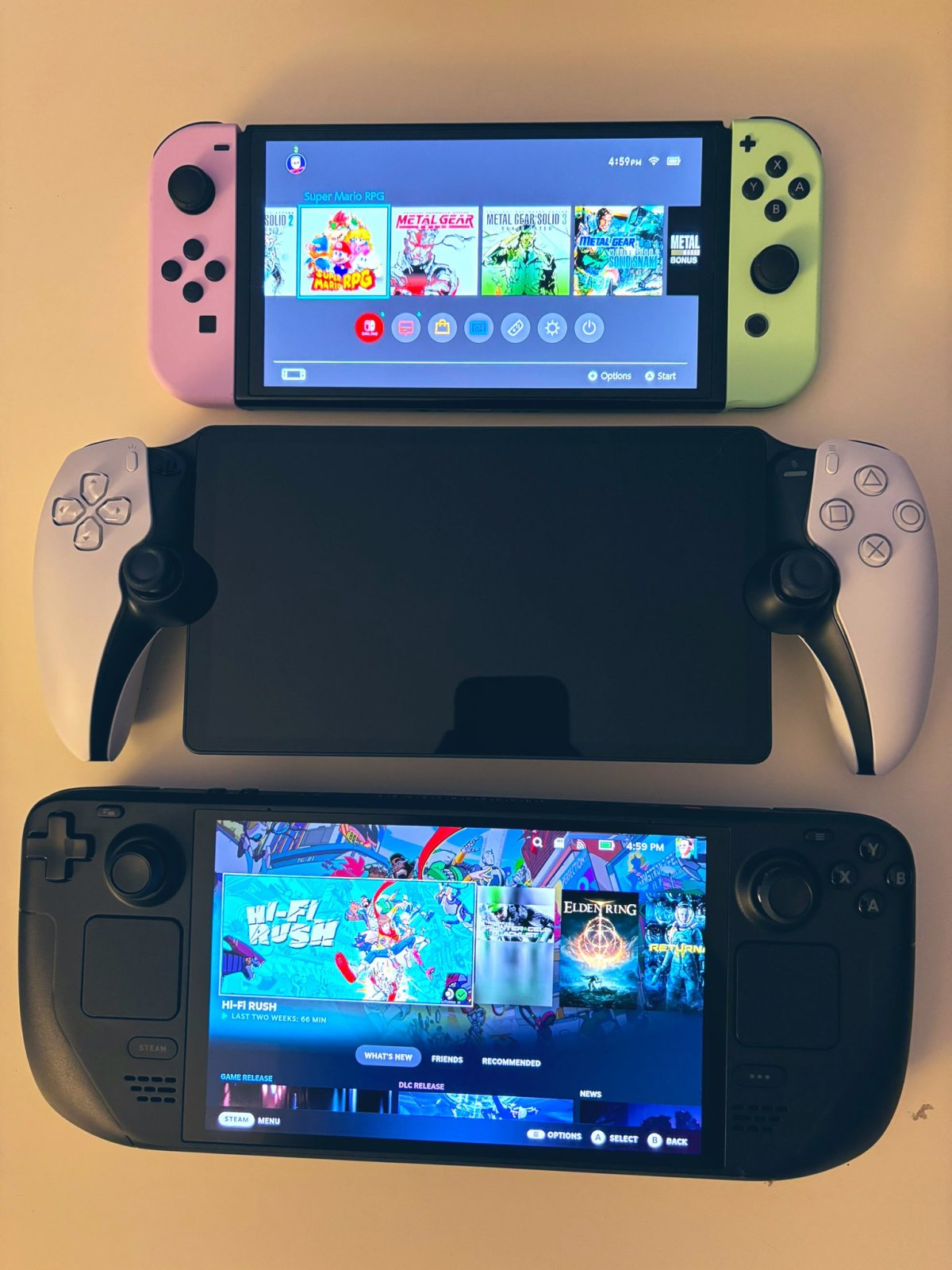 這是由《華盛頓郵報》(The Washington Post)知名電玩媒體人Gene Park,在Valve宣布不久後,於Twitter(現稱X)上所分享的掌機對比圖。在圖中除了可以看到媒體率先拿到開箱的Steam Deck OLED之外,也包含了Nintendo Switch OLED,以及即將上市的PlayStation Portal。