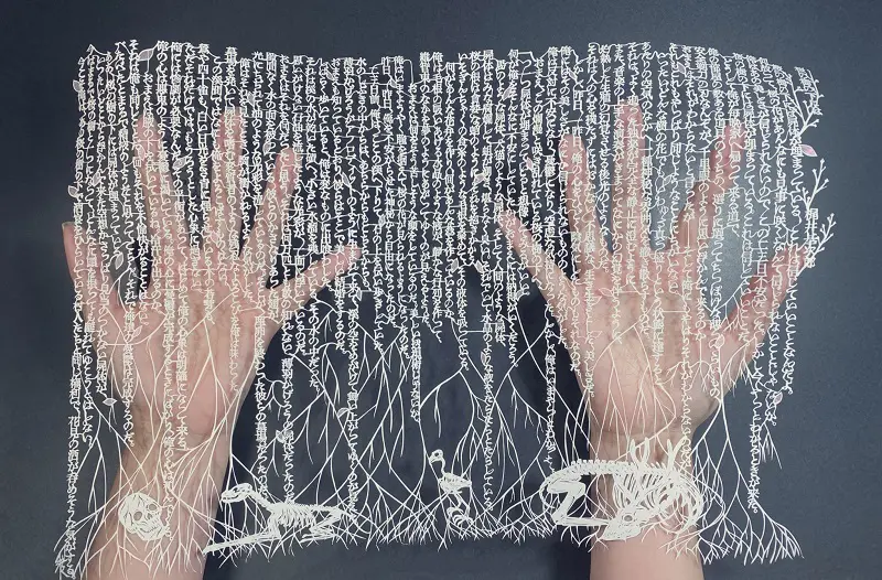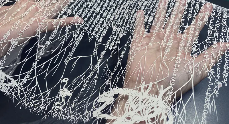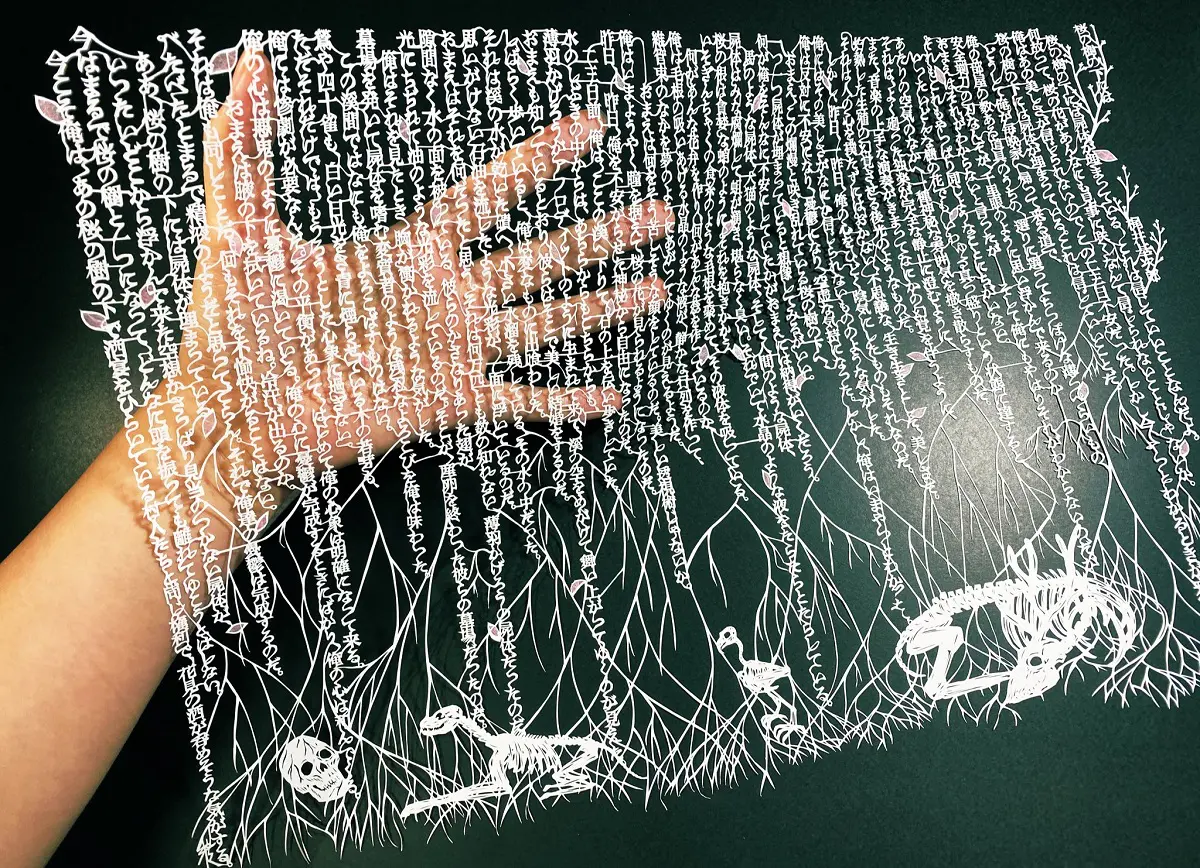 他選用的是 20 世紀初期的日本小說家梶井基次郎(1901-1932)的短篇小說《櫻樹下》 (櫻の樹の下には),這部作品在表達在櫻花樹下有個屍體,講述其中的故事與背景,他在想如何把故事具體化呈現,決定用上自己的剪紙手藝,把一張 A3 紙變成了文字藝術。
