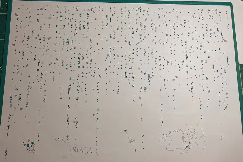 可以看到 A3 紙張上,有著無數的細小文字與底下的插圖,這些東西都必須由親手剪下成形,非常費時又需要細膩的技術。