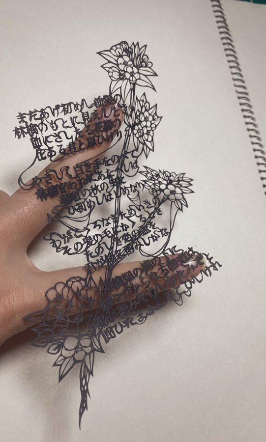 今天要來介紹一位剪紙藝術家梨々(@ririkirie),他使用紙雕技術將小說的扉頁文字一筆一劃的刻下來,形成一個薄如羽翼卻有著高超視覺效果的藝術品。這樣的創作也備受網友肯定,從沒想過剪紙可以將文字變成這個樣貌。