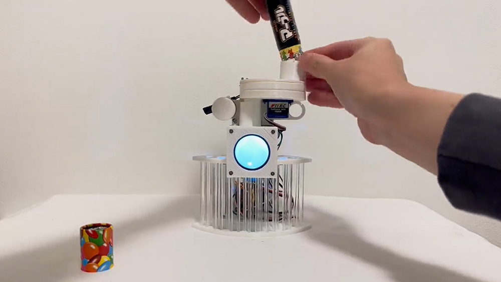 這台「i-SWIRL」是可用來分類明治推出的巧克力糖豆「大理石巧克力」的機器,這機器會根據顏色感測器來進行分類,大理石巧克力一共七種顏色,所以機器上的分類槽也就有七個。啟動它很簡單,首先要有一條大理石巧克力,接著將裝著巧克力的管塞到機器的投入口填裝,而蓋子則作為開機的「鑰匙」,開啟後機器就會自動分類。