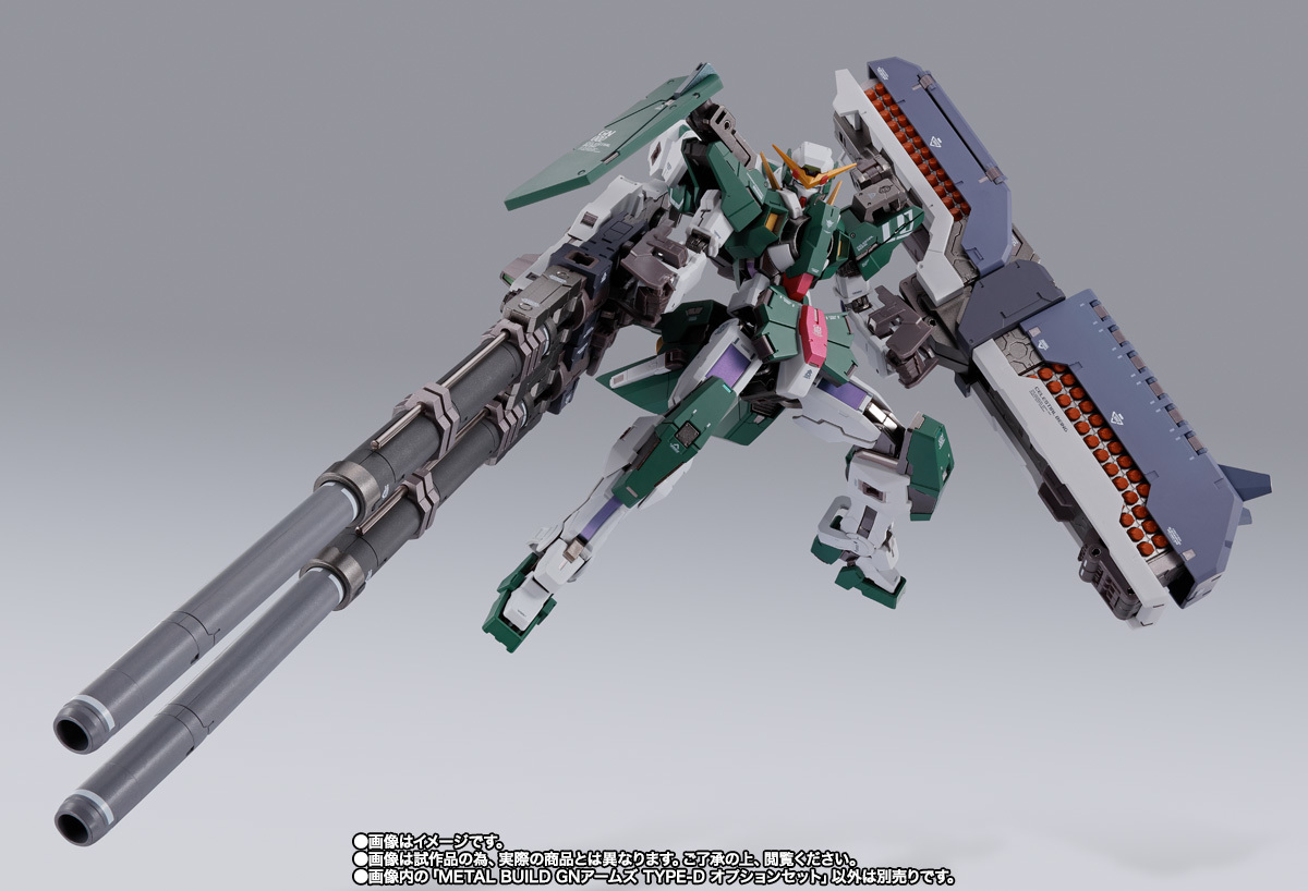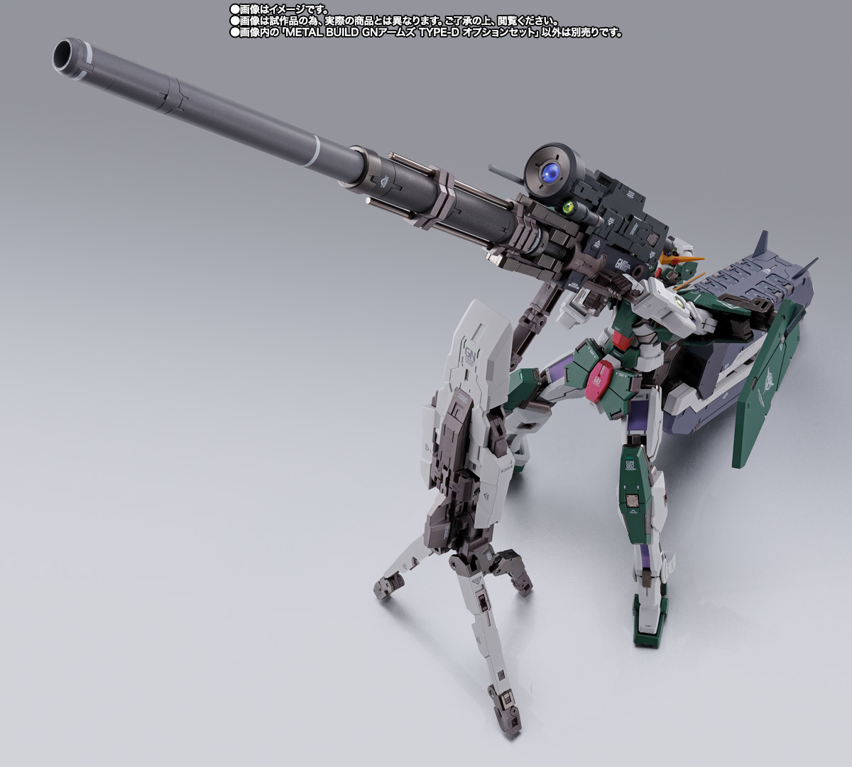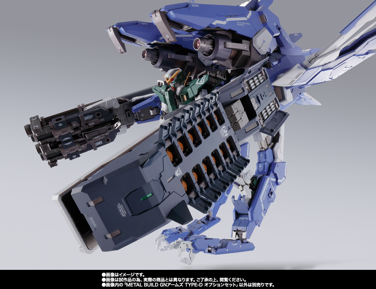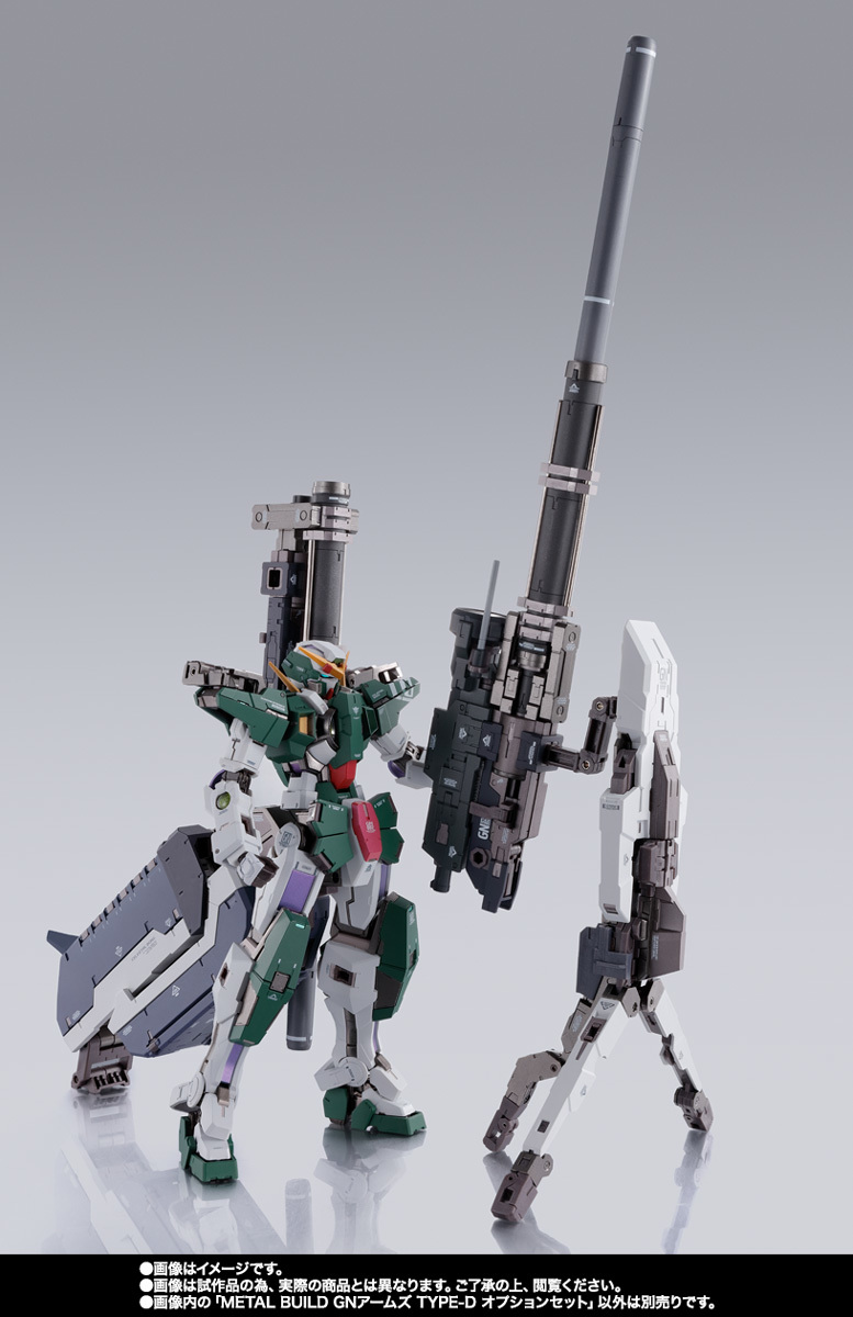 此次推出的「METAL BUILD GN ARMS TYPE-D 擴充零件組」內容包含了尺寸極為魄力的「二連裝大型 GN 步槍」、「超大型 GN 導彈艙」、「感測器組件」等武裝,在柳瀨敬之、海老川兼武等人的監修下賦予異於原作的設計,搭配另售的「GN ARMS TYPE-E」、「力天使鋼彈」本體就能進行換裝。