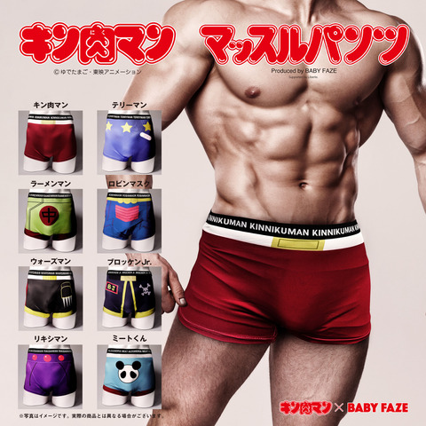 日本知名藝術總監 BABY FAZE(齊藤伸也)曾為 SKE48 、 TM Revolution、King & Prince等藝人合作過,包含設計專輯封面與藝術指導等工作。先前也曾推出過「聖鬥士黃金聖內褲系列」蔚為話題,這次把目標轉向金肉人了 XD。
