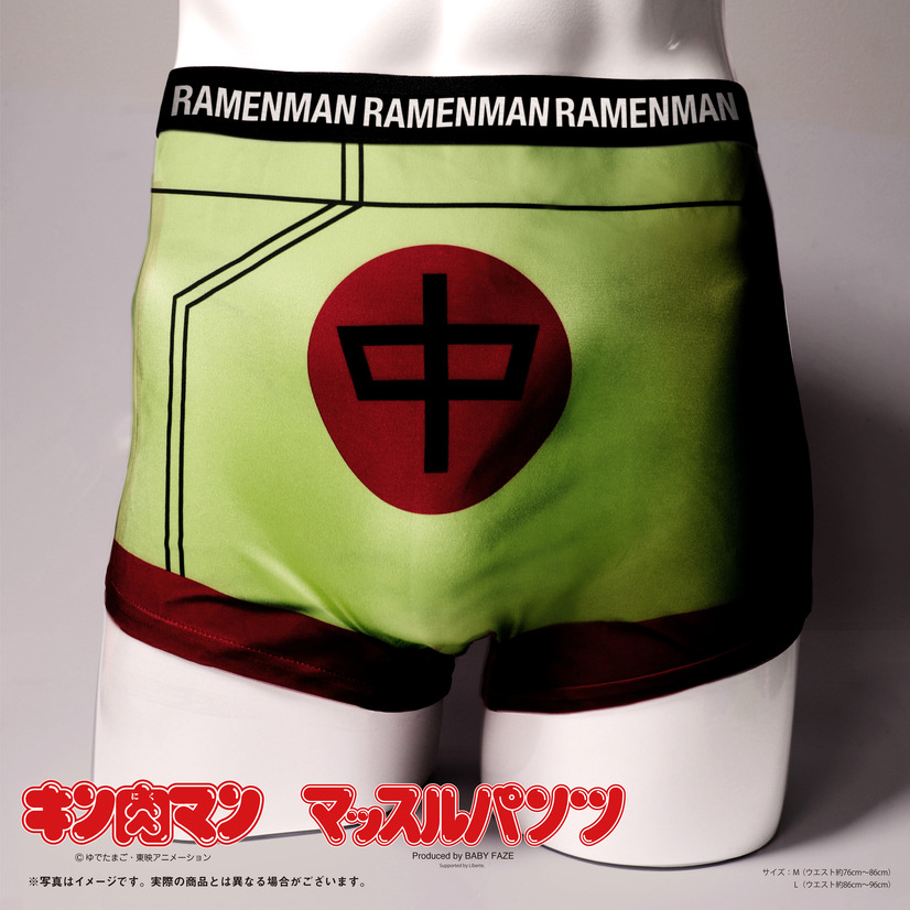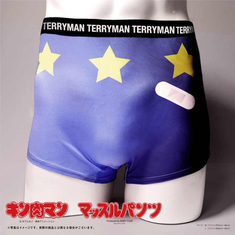 這次「肌肉內褲系列」推出八款造型四角內褲,包含 : 金肉人、泰利人、拉麵人、羅賓假面、戰爭人、破裂二世、力士人 ( リキシマン ) 與米特君,將各角色的元素融入其中,並展現出正義超人的與眾不同 ( ? )