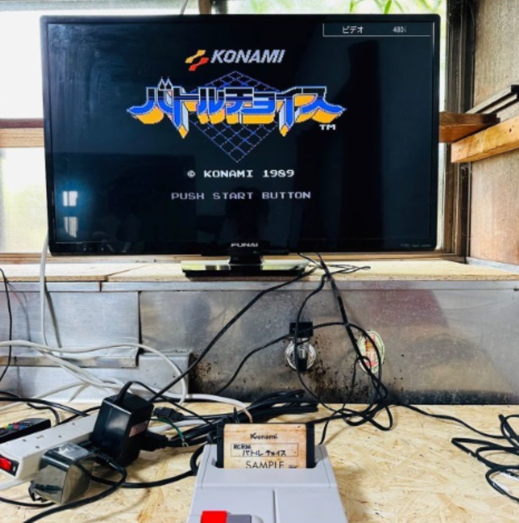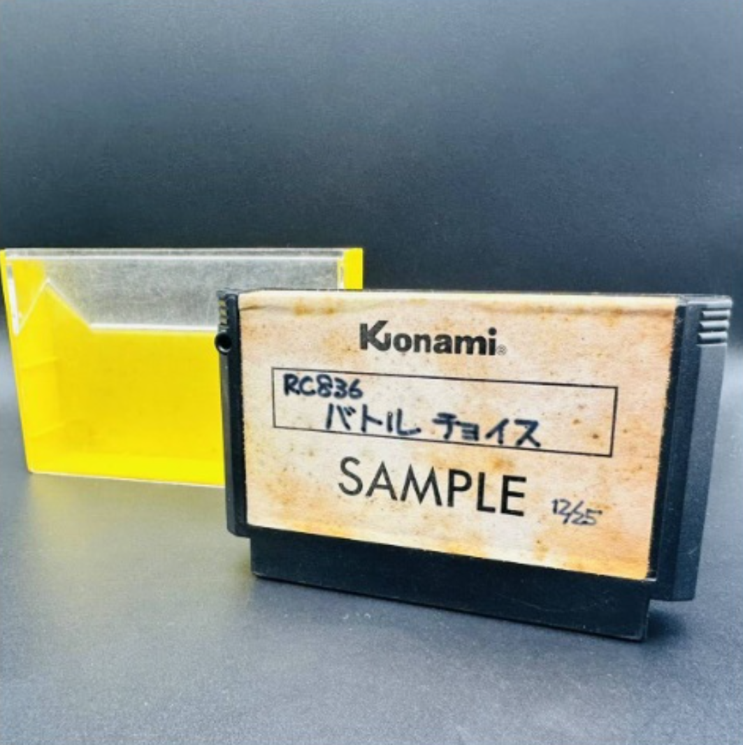 這是 KONAMI 當年一款名為「Battle Choice」的未發佈的樣品遊戲卡帶,可以看到上面泛黃的貼紙與手寫文字,雖說這款遊戲沒有發行,卻在 2015 年發售的遊戲原聲帶「コナミ・ファミコン・クロニクル Vol.3 ROMカセット編」中,有收錄這款遊戲的音樂作品,當時也讓人好奇這款未發售的遊戲到底是什麼。