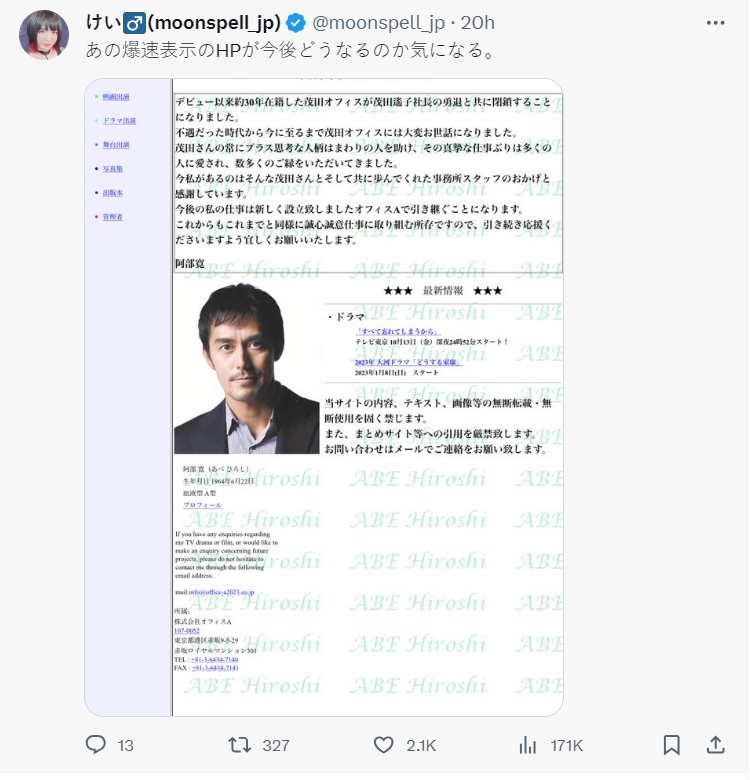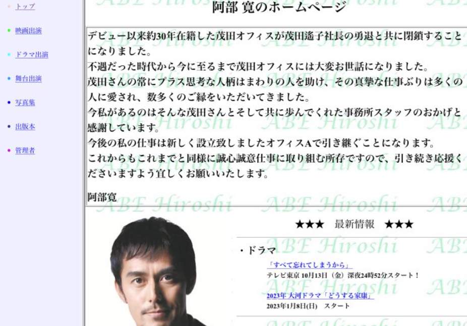 在昨日 ( 11/14 ) 下午,日本知名男星-阿部寬宣布將離開從出道以來的經紀公司茂田オフィス,目前已經到新成立的經紀公司オフィスA,阿部寬也在官網上感謝前經紀公司 30 年來的栽培與努力。不過,不少網友比起關注新經紀公司,卻更擔心著名的「阿部寬網站」會不會因此消失呢 ? 這也成為了日本話題之一。