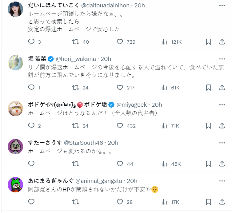 許多網民都表示不希望舊官網也消逝更換,畢竟先前茂田オフィス旗下的藝人,都有著類似的「爆速官網」,現在換公司了,希望維持舊有風格,也是粉絲們的期許。