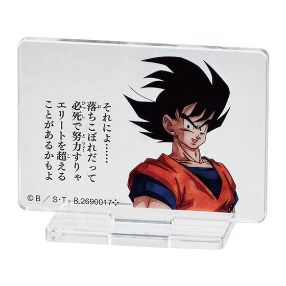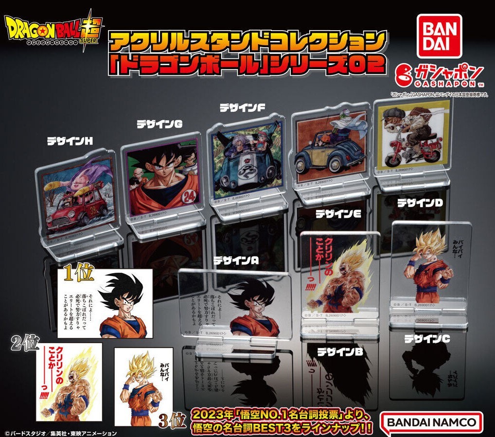 「GASHAPON 壓克力立牌收藏 七龍珠系列02」轉蛋,特別收錄了 2023 年 5 月 9 日悟空日舉辦的「悟空No.1名台詞投票」前三名台詞,並以特殊的50mm 尺寸規格製作,分別有:悟空首次與貝吉塔對戰後說的:「況且,只要不斷努力就可以變強,即使是被淘汰者也可以追上天才!」、讓佛利莎嚇尿的:「你是說克林嗎!!!!!」、在賽魯篇準備與賽魯一起自爆的:「再見了,大家...」,另外則是五款漫畫原作的扉頁插圖與漫畫封面,無論是和角色模型一起展示或是搭配漫畫都非常有意思~