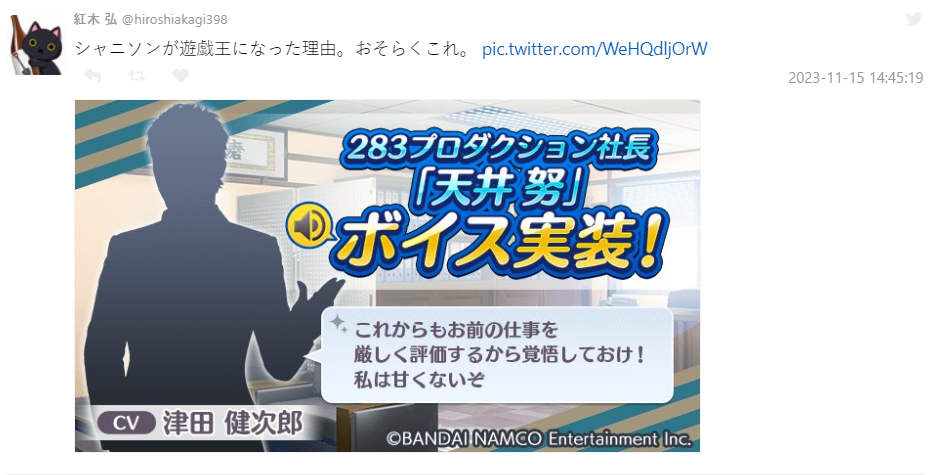 沒想到偶像育成居然還要打牌,網友就想到《偶像大師 閃耀色彩》283 事務所的經營者天井努,聲優就是津田健次郎,也就是海馬瀨人的聲優,這樣要打牌好像也不意外了,社長就是不一樣阿 XD。