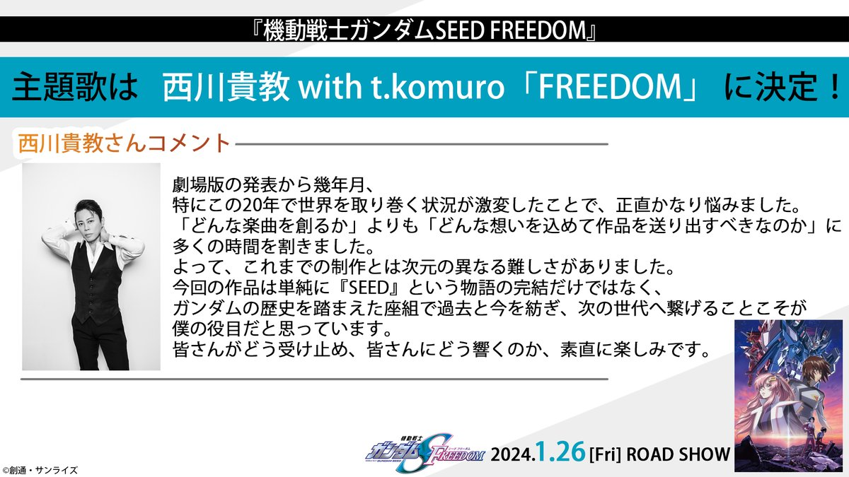 當時以「T.M.Revolution」(本名西川貴教)名義獻唱《機動戰士鋼彈 SEED》OP1「Invoke」想必對所有 SEED 粉絲一定熟悉到不行,這次劇場版給教主來唱再適合也不過。