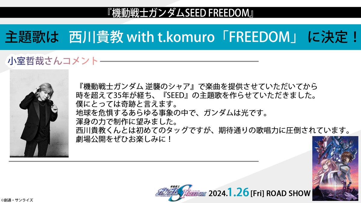 此外這次 t.komuro ( 小室哲哉 ) 也一同獻唱,對小室來說上一次跟鋼彈合作已經是 1988 年的《機動戰士鋼彈 逆襲的夏亞》 ,沒想到 35 年後能再次獻唱鋼彈 IP,根本是個奇蹟了。這次也首次和西川貴教合作,跟預想的一樣展現壓倒性的歌唱實力,非常期待電影的上映。