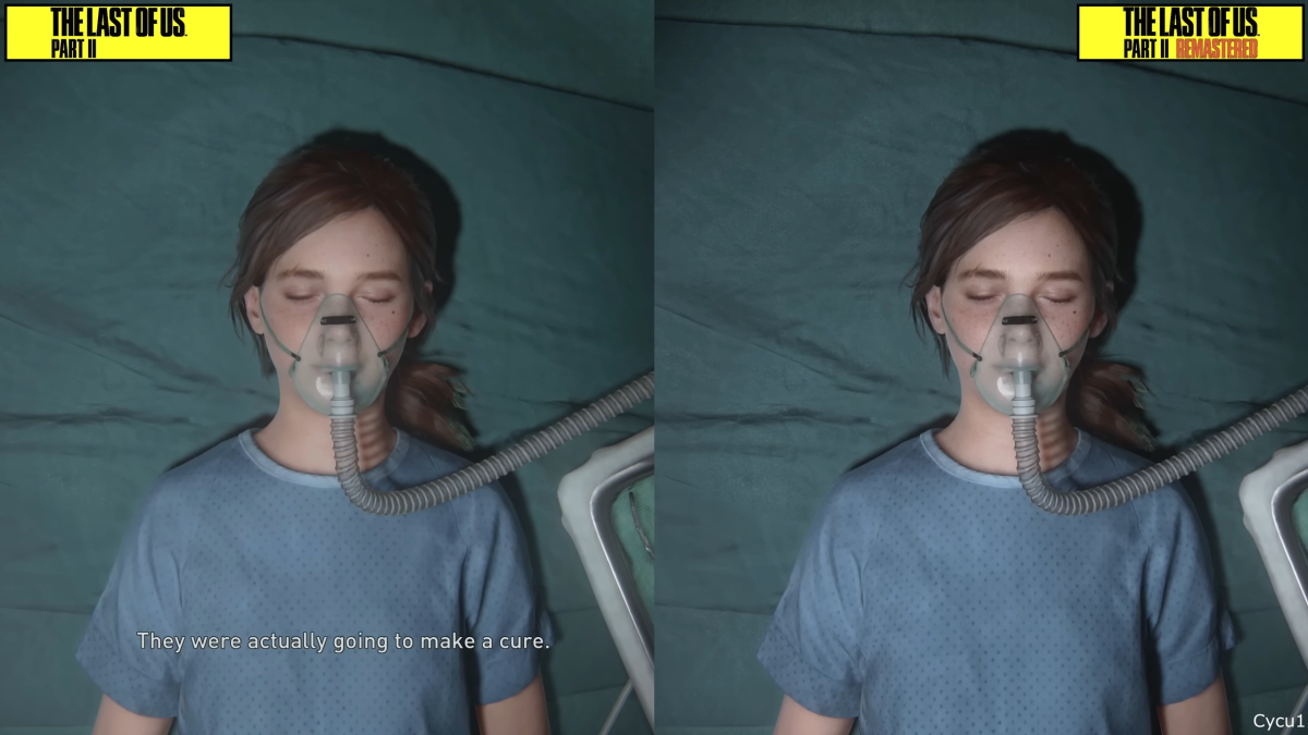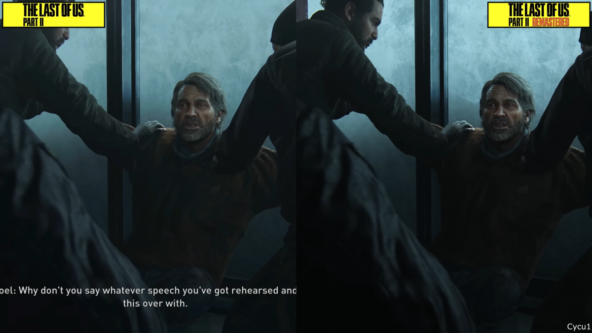 不過,也由於《最後生還者 第II章 修復版》與前作的發行時間也才不過短短3年,以致在Cycu1的對比影片當中,幾乎是看不出有什麼明顯的變化,若真要說的話,也幾乎僅僅是在對比度上有所差異,但那也只是微乎其微的差距罷了。