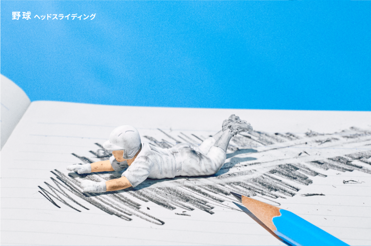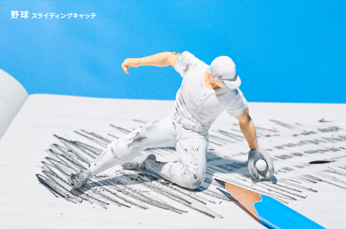 即便每一次的滑壘、每一次的飛撲都意味著要削掉身體的一部分,他們依舊勇於向前衝刺狂奔、不到最後關頭絕不放棄!白色制服上面的髒污是他們活躍於賽場的證明,來吧!一起來消除犯錯的恐懼。這次的「KE-SLIDING」可說是在橡皮擦轉蛋這個經典題材中注入了飽含新意的構想,一共有「棒球 滑壘」、「棒球 滑壘接球」、「棒球 頭部滑壘」、「足球」、「橄欖球」五種,除了形塑出運動員的身形線條外,躍動感十足的姿勢也有很棒的表現。