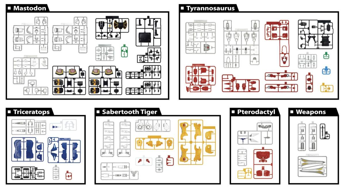 「風雷模型 大獸神」由 381 個 ABS/POM 製的銀、黑、紅、藍、黃、綠..等多色成形零件、部分預先上色零件構成,組裝完成後能夠完成霸王龍、猛瑪象、三角龍、劍齒虎與翼手龍,忠實再現各機的色彩與紋路,並且具備和原作相同的可動機構、變形合體機構,合體完成後就能以全高 21 公分的尺寸再現大獸神!