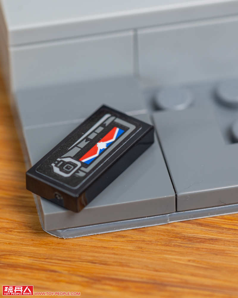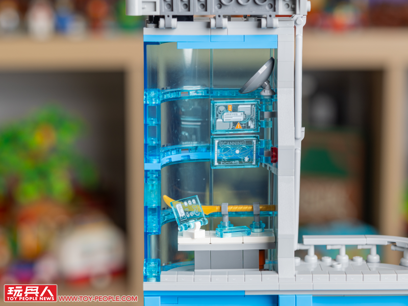接著來看看復仇者大廈每一層的內裝細節吧!組裝完成之後雖然可以藉著拿起側邊玻璃一窺內部,但許多地方基本上在組裝時才能完整享受,組完後要看到其實不是那麼容易,這應該算是這一組唯一美中不足的地方;先把側邊的窗戶移開吧~可以看到是利用 1 格的溝槽寬度來固定。