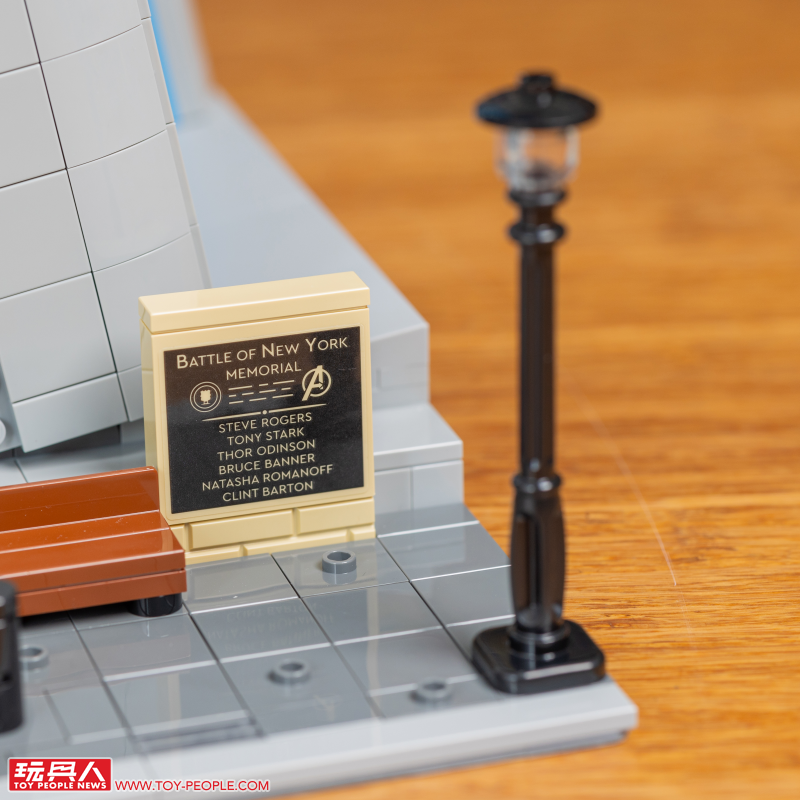 ▼ 紐約之戰的紀念碑,復仇者元祖六巨頭的名字都在上面;值得一提的是,這次的路燈是跟街景相反的黑色。