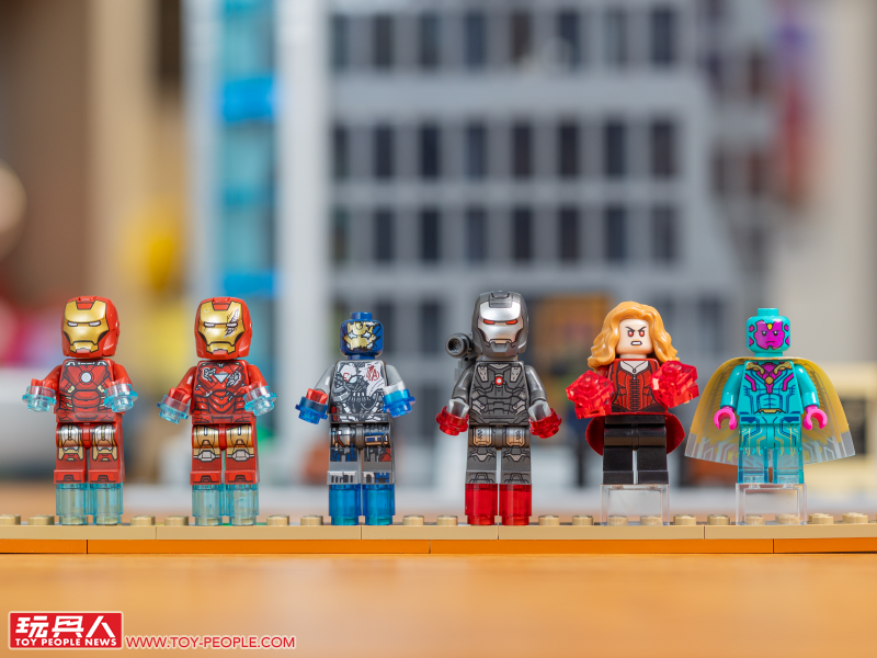 ▼ 鋼鐵裝馬克7、鋼鐵裝馬克6(戰損)、奧創(初登場)、戰爭機器、汪達、幻視,幻視的半透明腿部零件超級漂亮,也表現出他可以穿透物質的能力!