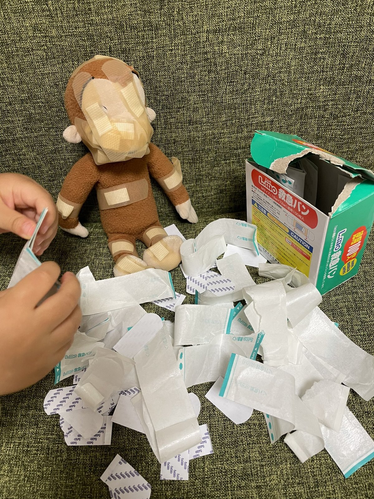 小孩子玩醫生遊戲玩得很開心,但對於大人來說,看著整盒OK繃就這樣一條又一條地被黏在其實根本沒有生命的絨毛玩偶上...也許這波傷害不只是體現在OK繃盒上,還有家長的心吧...