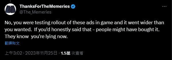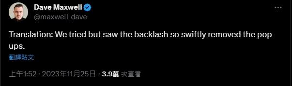 而因此事引發炎上後不久,育碧官方趕緊在Twitter(現稱X)上試圖平息玩家怒火,表示《刺客教條》遊戲內出現彈出式廣告的部份,本來是單純作為在遊戲選單中的促銷訊息,但由於技術錯誤,而導致破壞了玩家的遊玩體驗,而針對這部分目前也已經修復完畢。