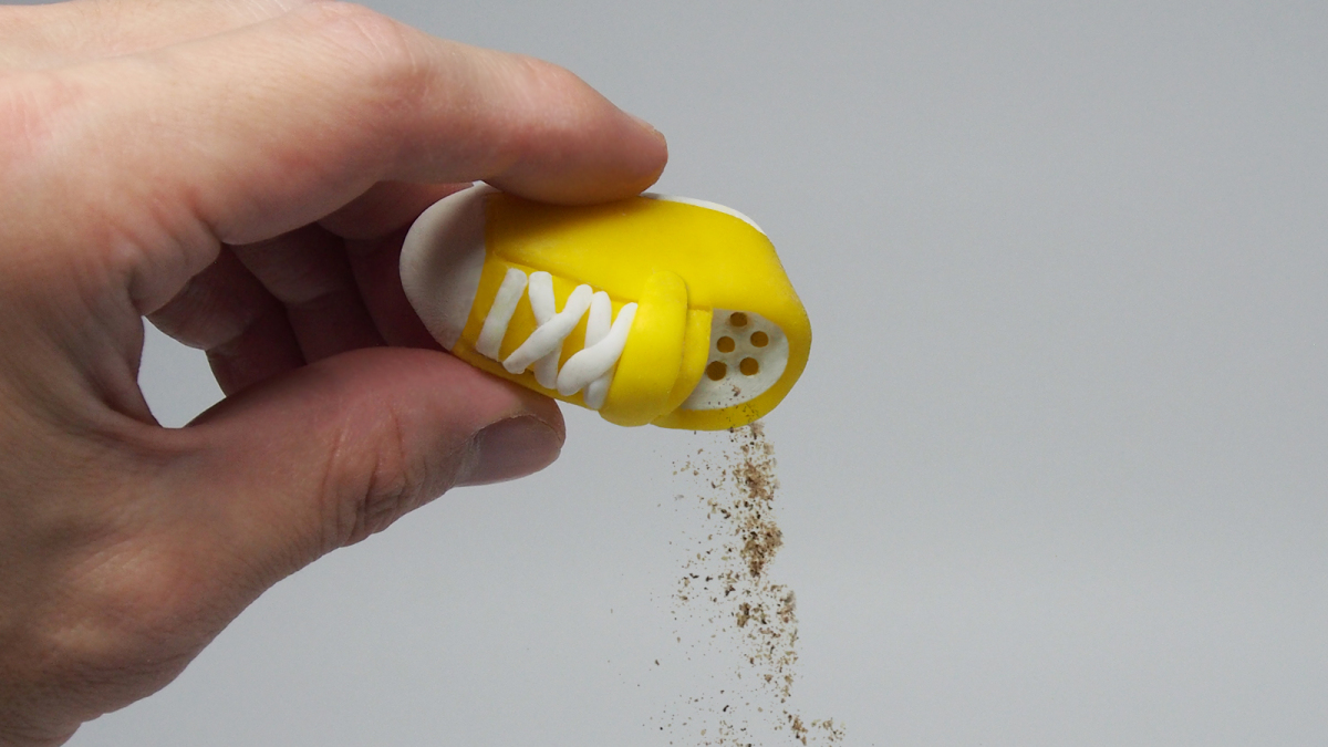 是的,以從鞋子倒出的沙子為設計發想,並將沙子改成了胡椒,讓在食用料理或是炸物點心時,就會因為傾倒胡椒粉的同時,不由得露出會心一笑的表情,畢竟小的時候做出這個動作,是為了把刺痛腳底的石頭沙子給倒出來啊!