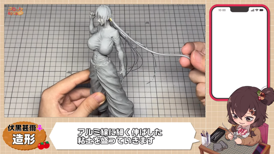 髮型上,想了很久決定採用黑長髮,用鋁線拉出長髮飄逸的樣貌,再用黏土補正後修飾。