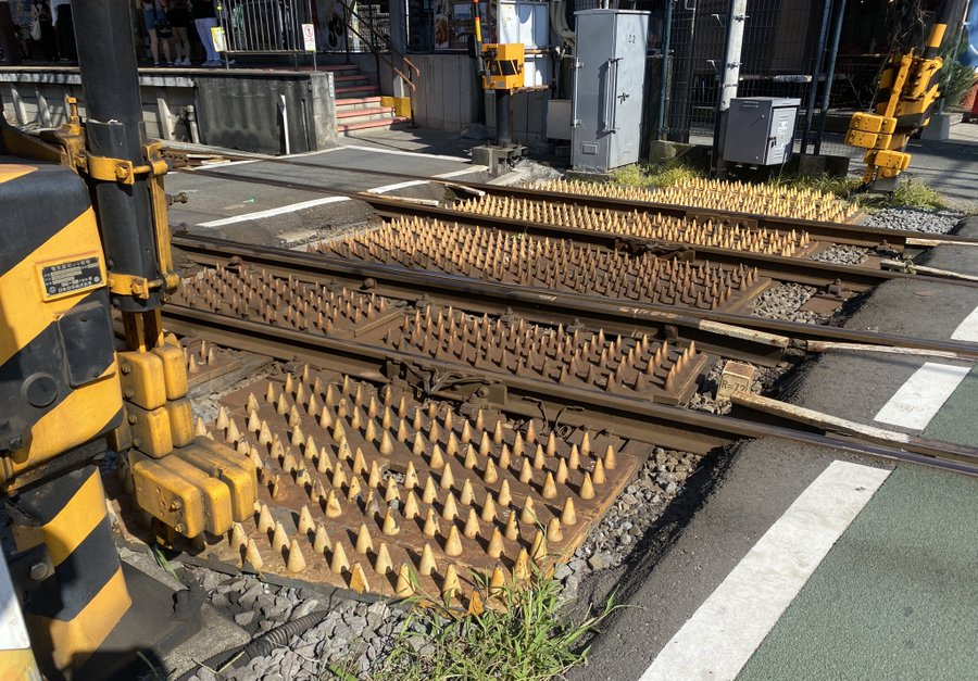 不過在日本,好像有更強大的設施,近日在 X 上有網友貼出這個平交道間的「劍山」,看起來佈滿了尖刺感覺十分危險,這樣的景象也吸引網友熱議。