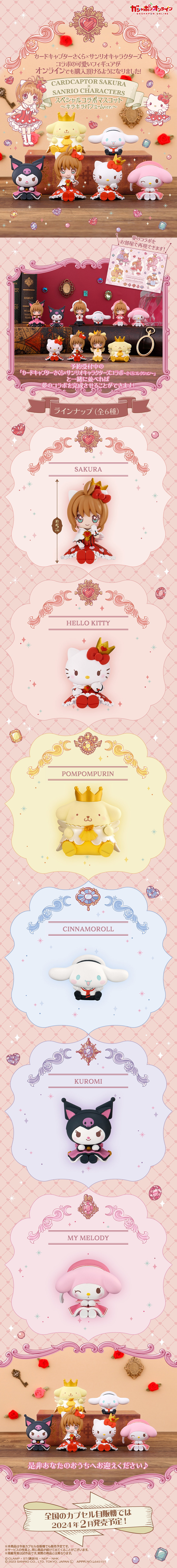 超人氣的百變小櫻《庫洛魔法使》與三麗鷗攜手,這次以聯名香水的設計為主軸,讓三麗鷗角色們穿上小櫻夢幻風格的美麗洋裝~分別有川著同款服裝的小櫻 SAKURA與凱蒂貓 HELLO KITTY,布丁狗 POMPOMPURIN、大耳狗 CINNAMOROLL、庫洛米 KUROMI、美樂蒂 MY MELODY,一共六款角色。華麗的荷葉邊細節,施以質感的金屬塗裝點綴,以約 5 公分的尺寸打造,每一款都很繽紛可愛!與另售的小櫻收藏一起擺飾,完整收藏這次的夢幻聯名~
