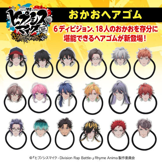 由於《催眠麥克風》是一個 18 名男性聲優 RAP 對決企劃,所以全部人都一次推出,可以看到每個角色都將大頭製作成髮圈的裝飾,看起來...好像哪裡怪怪的 ( ? )