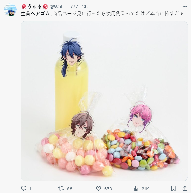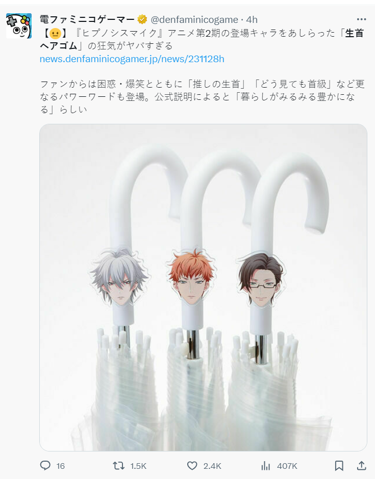 而今日 ( 11/28 ) 由日本國王唱片推出多媒體企劃《催眠麥克風》(ヒプノシスマイク,簡稱「ヒプマイ」) 推出了更奇妙的東西。這周邊叫「大頭髮圈」( 生首ヘアゴム ) ,直接把角色的頭用壓克力製作成髮圈裝飾,這奇妙的設計一出也登上本人 X 趨勢,引發網民熱議。
