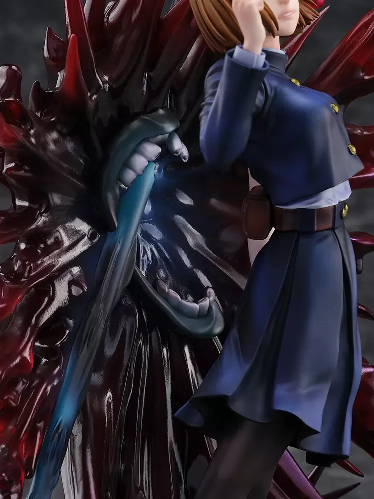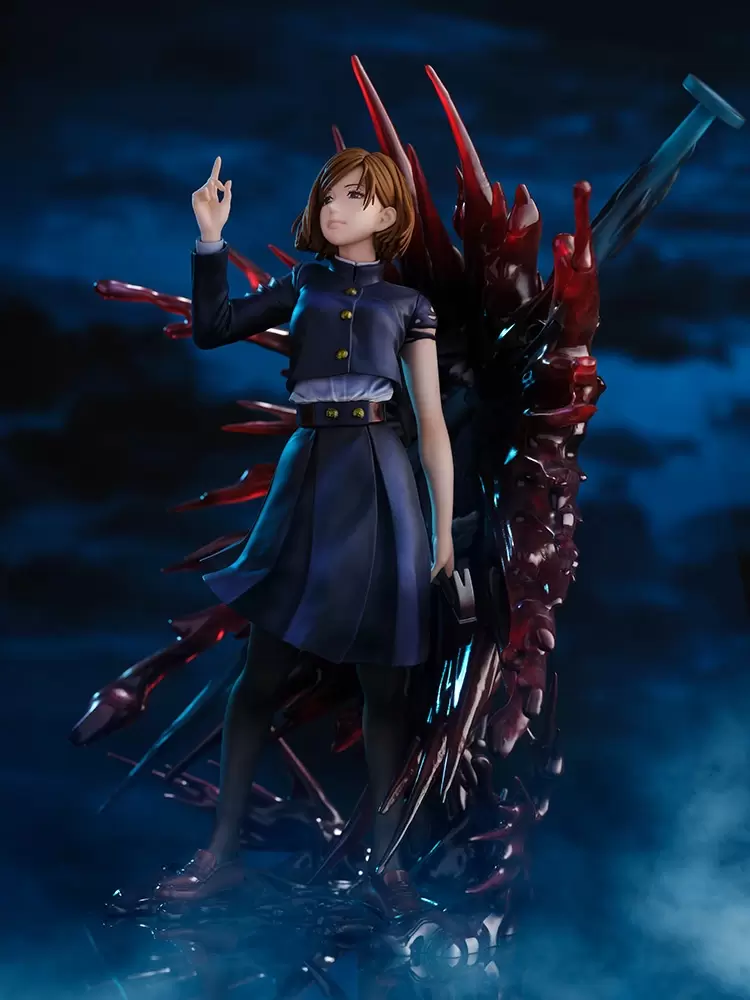 「 S-FIRE 釘崎野薔薇」1/7比例模型,尺寸全高約 25 公分,造型以TV動畫第1期「起首雷同編」中,釘崎與血塗對戰時使出「芻靈咒法・簪」的場景為基礎,以直接從動畫中截取般的生動效果徹底還原釘崎帥氣的姿態,背景強烈的咒力特效以巨大釘子貫穿,相當有氣勢(不過最重要的臉部卻有點不知道發生什麼事了)!制服透過陰影塗裝強調服裝的皺褶,搭配動作表現出質感的效果。另外,搭配專屬的應用程式「Play AR」可以開啟與模型連動的 AR 特效功能,呈現出超越現實的強大視覺特效。
