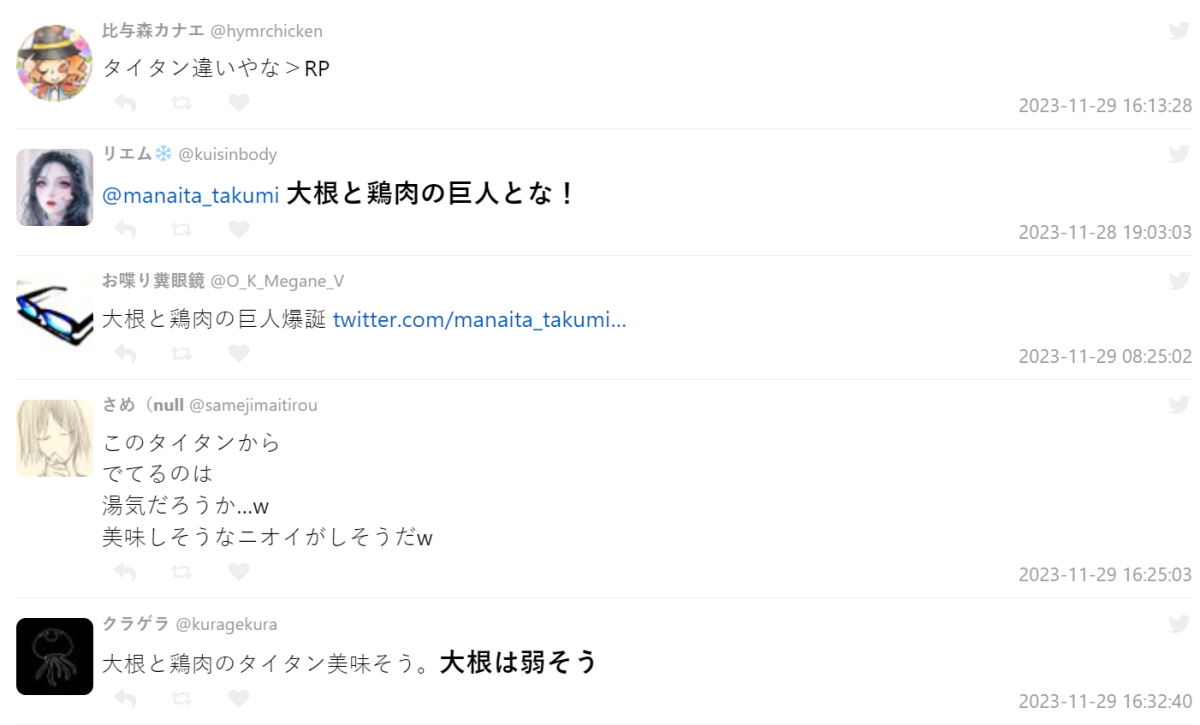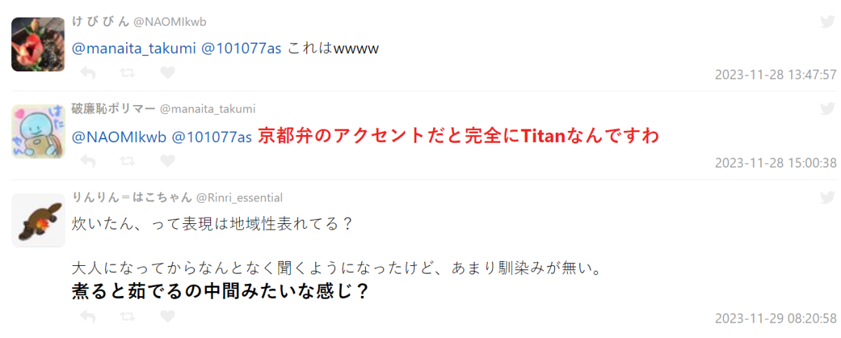 近日 X 上有網友指出,在職場附近的便當店買東西時,看到有外國人士正聽店家告知菜單品項,其中的「燉煮白蘿蔔」一餐,因為京都弁的關係,發音「炊いたん」讓外國人聽成「titan」( 意指巨人 ),這樣的誤會讓人啼笑皆非,分享在 X 上後也成為話題。