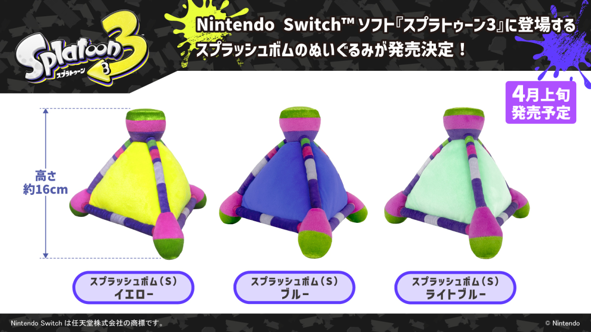 三英貿易推出的「斯普拉炸彈(小)布偶」擁有全高約 16 公分的可愛尺寸,並且共推出螢光藍、黃、深藍三種色彩可選擇。造型忠實再現飯糰般的三角錐體、色彩鮮豔的框架,讓你可以像遊戲一樣丟出斯普拉炸彈,和朋友們一同玩耍。不過它的售價也很任天堂,一顆就要價 2,530 日圓。